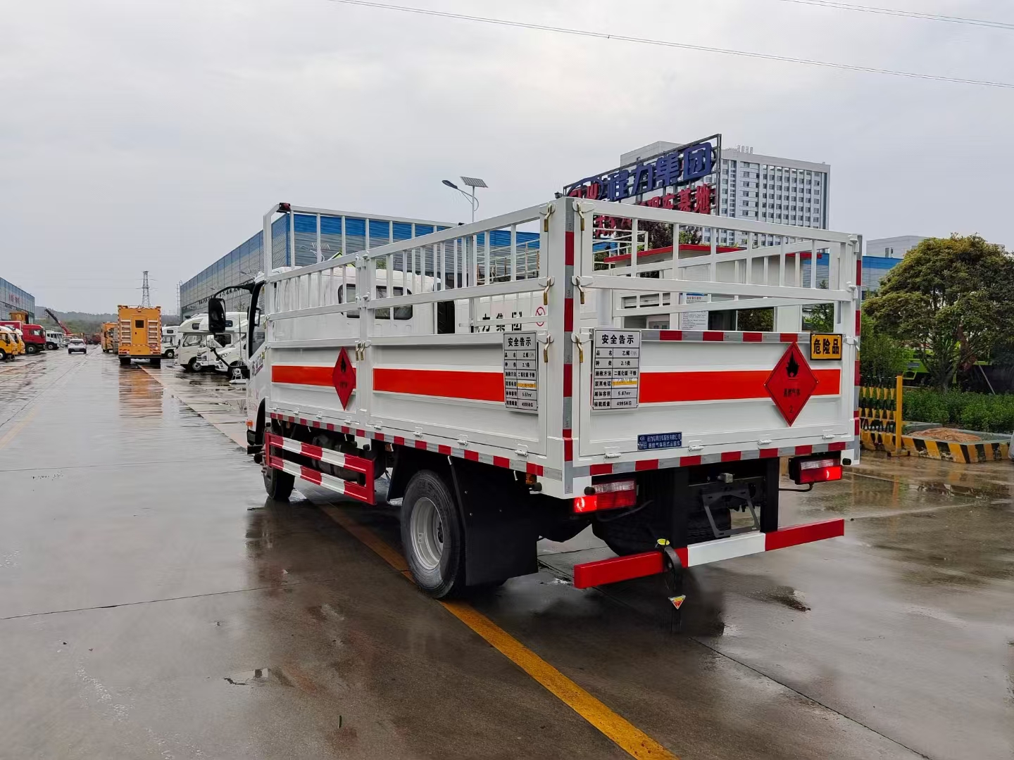 底盤配置 虎VN平頂單排駕駛室,錫柴CA4DB1A14E68,6GS42,270沖焊橋(速比4.875、輪距1640),速比4.875,7.50R1616層級真空胎,帶國產ABS,前盤后楔制動器,空調+電動門窗+中控鎖,氣喇叭,高架箱,80L鋁合金油箱,板簧3/7+3,前輪帶爆胎應急裝置,前碰撞預警+車道偏離輔助預警,前下防護,防飛濺擋泥板,排氣火花熄滅器,限速79km/h,北斗+GPRS行車記錄儀(帶視頻記錄功能),帶靜電拖地帶,NFH,危險品專用底盤