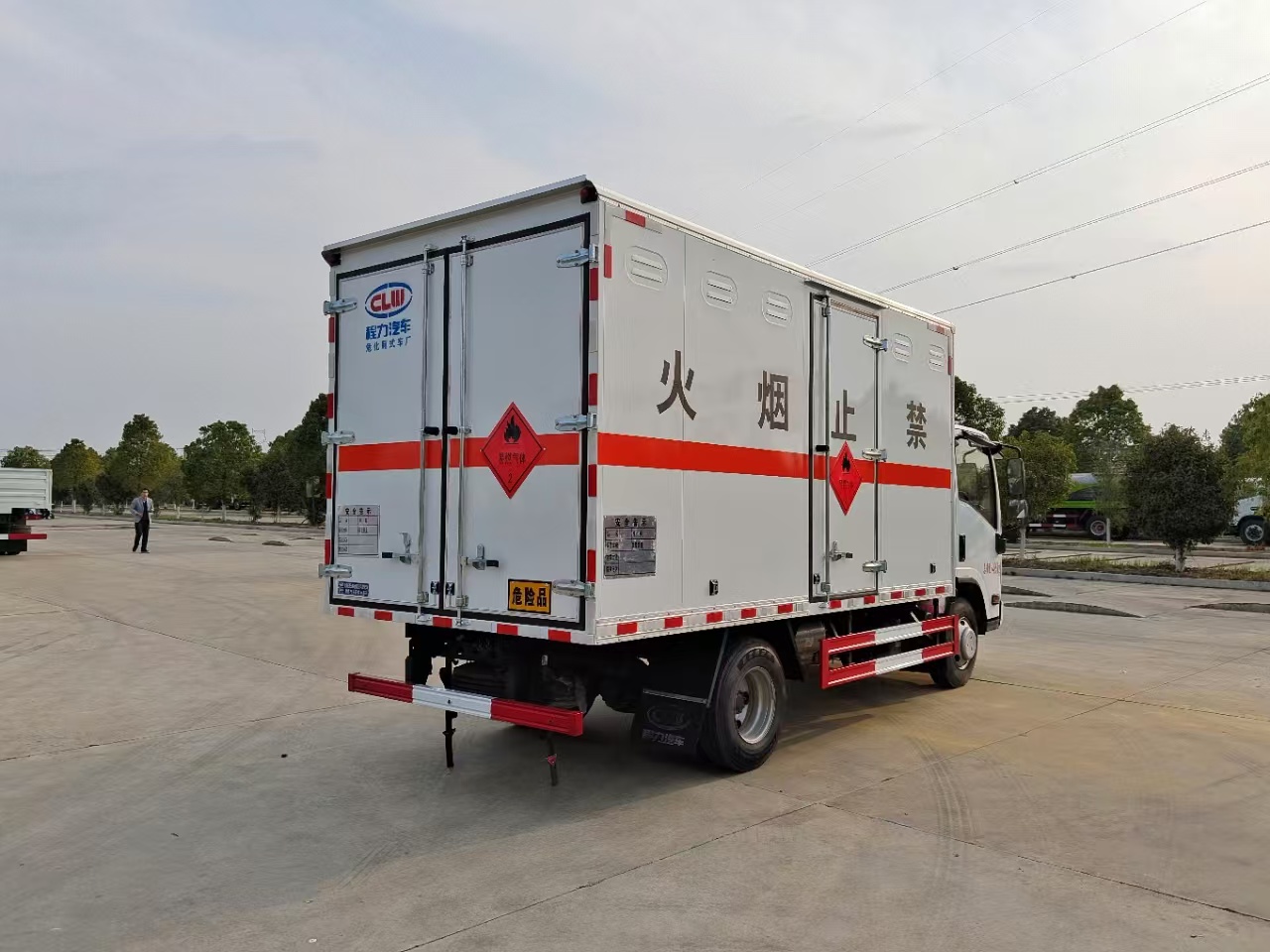 | 貨箱配置 | 廂體為雙層金屬骨架結(jié)構(gòu),外板采用冷軋鋼板,中間填充阻燃泡沫,內(nèi)飾為鋁板。底板為平板上鋪防靜電膠皮。廂內(nèi)兩側(cè)加裝固定貨物臥環(huán),門框帶防盜報警器,頂部帶煙霧報警器,廂體右側(cè)選裝側(cè)門,隨車配2個滅火器,危險標(biāo)志牌,防火帽,危險品三角頂燈。(選裝瓦楞板貨箱) (尾部可選裝液壓升降尾板) | ||
