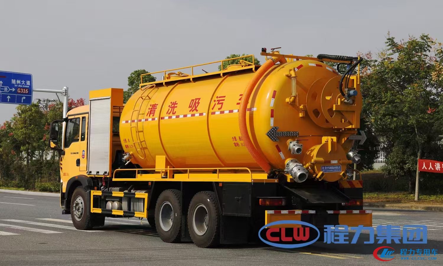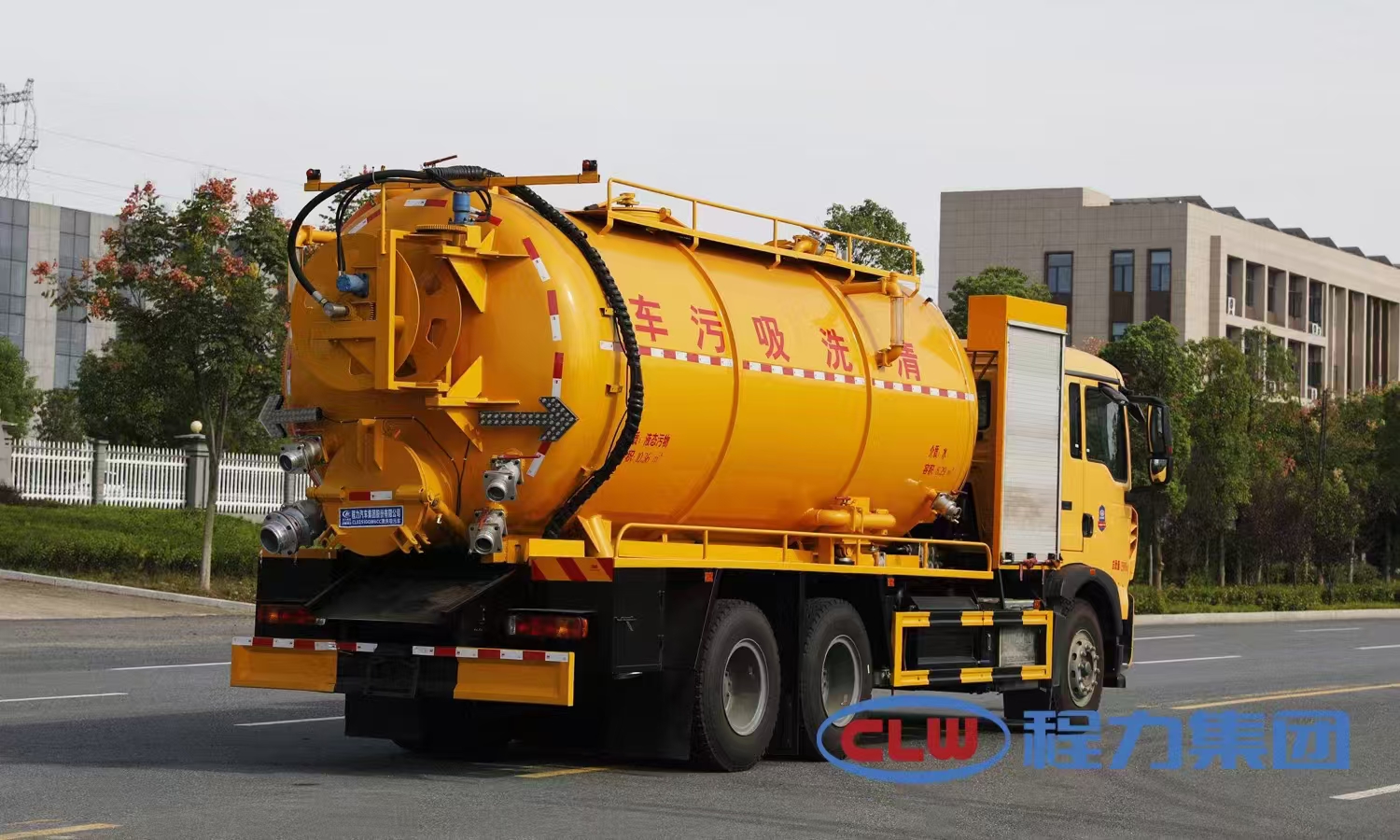 上裝配置 罐體容積22立方左右,清水罐5立方,其余為污水,罐體8mm厚,封頭8mm厚,舉升頂為自卸中置頂,副駕駛一側清水罐和污水罐用DN100球閥互通,另罐頂裝一個互通,副駕駛一側按照公告圖片安裝爬梯; 清水罐:品浮350高壓泵,罐頂水車罐口一個,帶爬梯,高壓管100米22號高壓管,尾部液壓卷盤,左右各裝一個消防栓進水口,清水罐裝兩側各一個小球閥,罐底裝一個DN65排水閥, 吸污罐:一個散水罐口,罐體內部鋪1.2米不銹鋼板,罐內爬梯,罐體內部防浪板加固,水循環泵水箱為碳鋼材質,副駕側排150鋁合金球閥,吸污罐尾部不開大蓋,開600小蓋排污口,尾部600小蓋左側一個150排污口,右側一個100的進料口,一個100鋁合金排污口,側邊一個100排清水,罐體尾部兩側工具箱,1根10米吸污管,箭頭燈,手動油門。