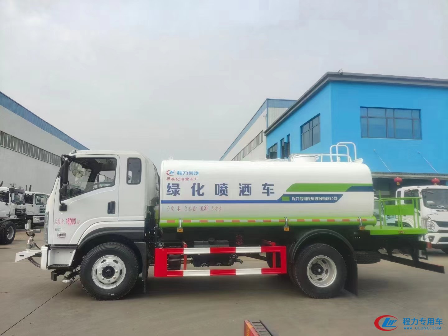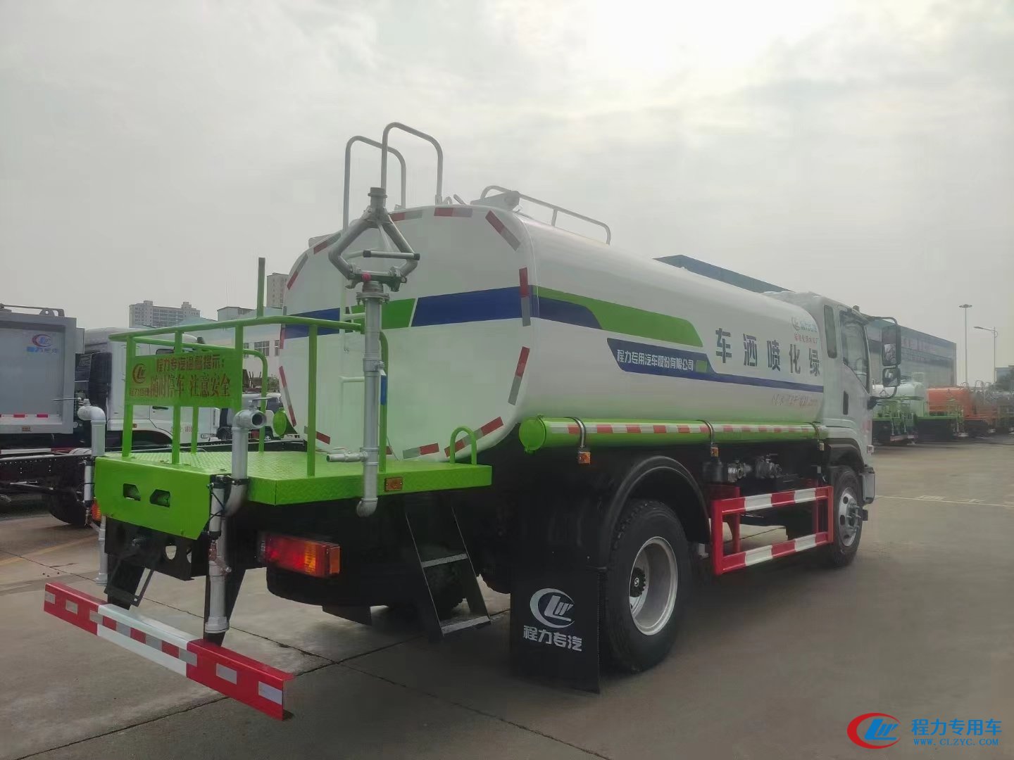 上裝配置 上裝武鋼優質碳鋼板,容積12立方,厚度4mm,封頭5mm,前后封頭機器人自動焊,內設隔浪板,帶液位計, 配程力原廠大功率灑水泵,帶駕駛室電控操作,前沖后灑4個新式不銹鋼切斷閥,前沖 后灑 側噴 后高炮,后高炮可調節柱狀 雨狀和霧狀,新式沖孔工作平臺,主管道加粗,副管道全采用優質鍍鋅管道,帶自吸自排,自流閥,消防接頭,過濾裝置,邊燈帶電,其他標配…
